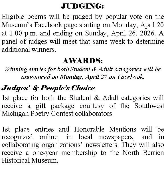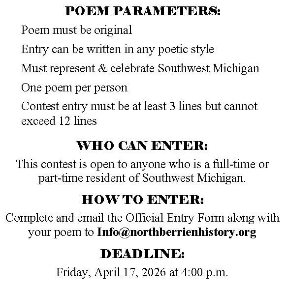 The 2026 Southwest Michigan Poetry Contest seeks creative writers to submit a short poem that represents and celebrates Southwest Michigan. Topics can include but are not limited to, geographical features, industry, community, historical landmarks and events, favorite vacation locations, and seasonal change. For the purpose of this Contest, “Southwest Michigan” is defined as the counties of Berrien, Cass, and Van Buren. One entry per contestant. Entries must be original and have been created in 2026.